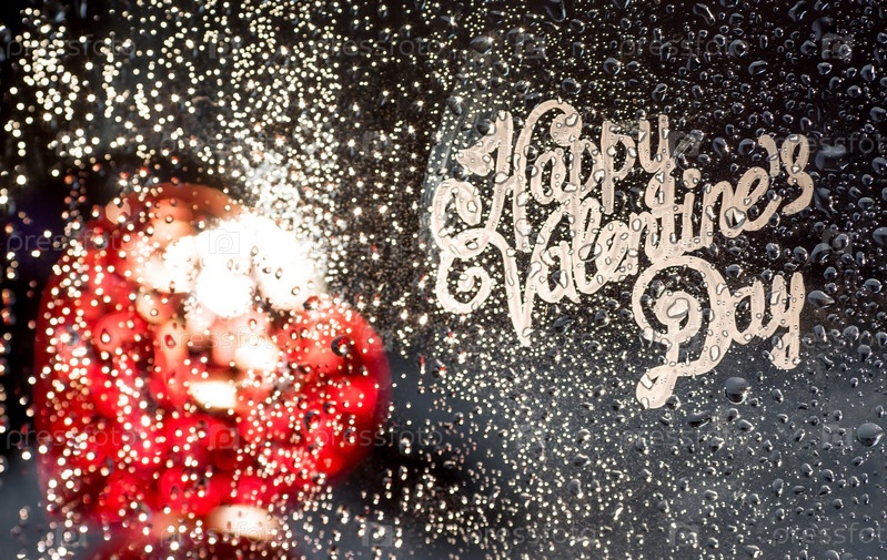 Красная ретро машинка с сердцем на крыше за дождливым окном. Доставка еды из кафе и ресторанов в День святого Валентина. Блокировка, ограничения и грусть в городе из-за коронавируса