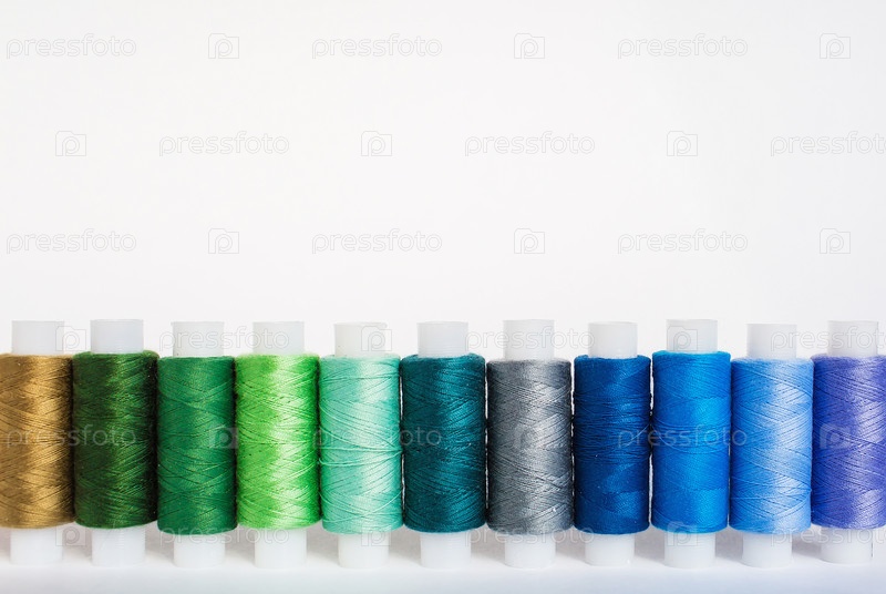 Портной рабочее место с разноцветными катушками ниток. Шитье как хобби. Вид сверху на белом фоне. Минимальный стиль