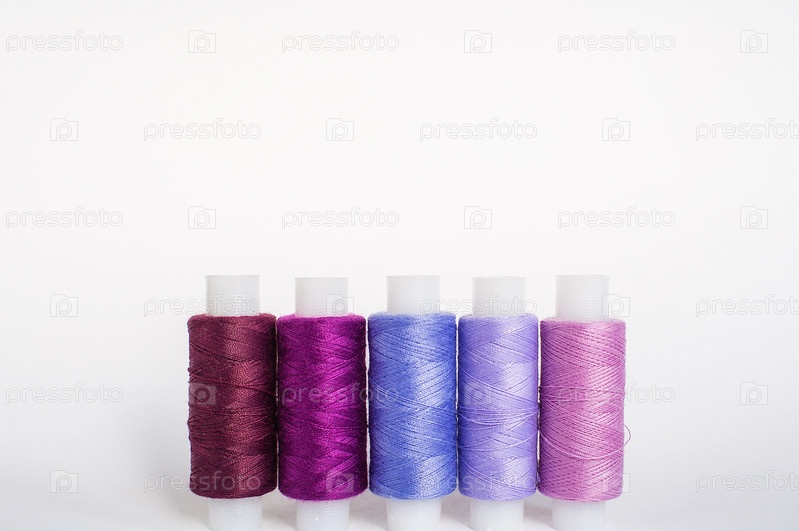Портной рабочее место с разноцветными катушками ниток. Шитье как хобби. Вид сверху на белом фоне. Минимальный стиль
