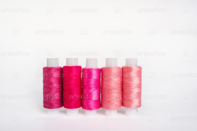 Портной рабочее место с разноцветными катушками ниток. Шитье как хобби. Вид сверху на белом фоне. Минимальный стиль