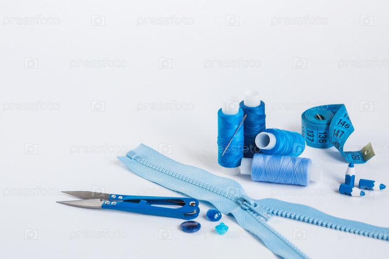Место работы портного с голубыми нитками. Шитье как хобби. Белый фон. Детали крупным планом