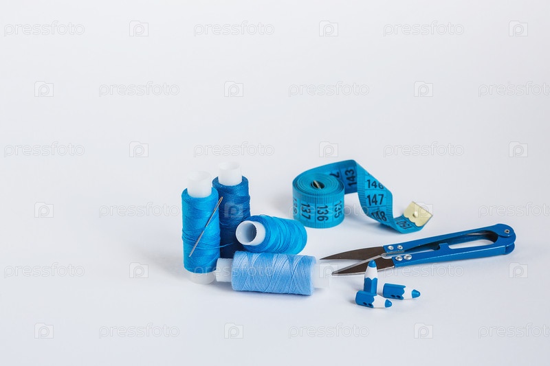 Место работы портного с голубыми нитками. Шитье как хобби. Белый фон. Детали крупным планом