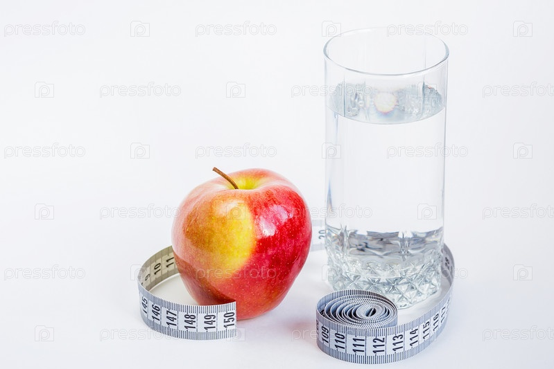 Диета, здоровое питание, еда и концепция потери веса. Измерительная лента рядом с яблоком и стаканом воды