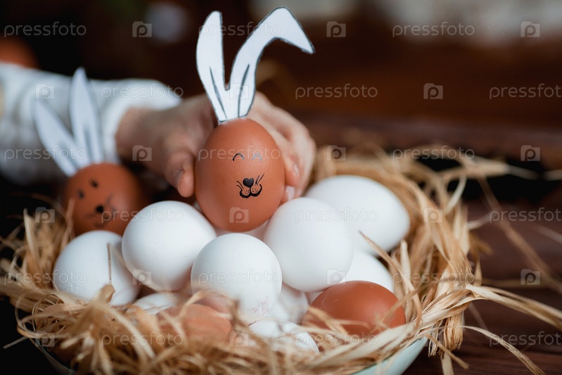 Пасхальные яйца в виде кролика на деревянном фоне