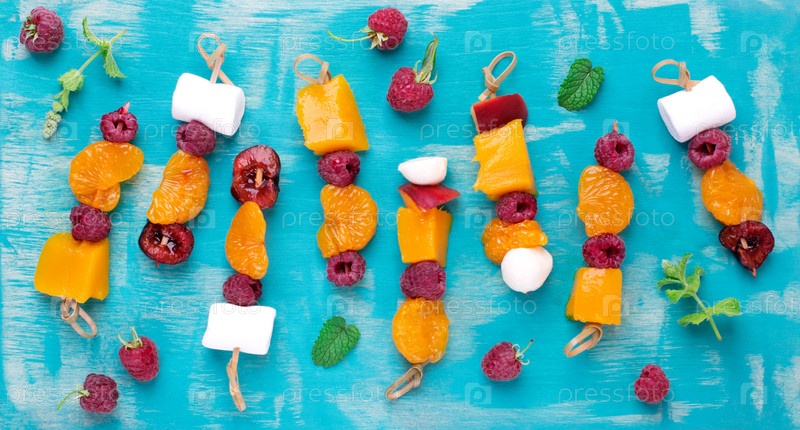 Фруктовые шашлычки с персиком, манго, мандарином, малиной, вишней, зефиром и моцареллой на бирюзовом столе. Плоская укладка. Летний десерт