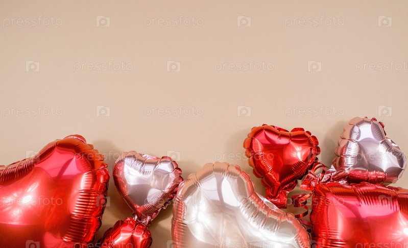 Текстовая рамка с воздушными шарами из фольги красного сердца вид сверху на бежевом фоне Дня святого Валентина. Копипространство