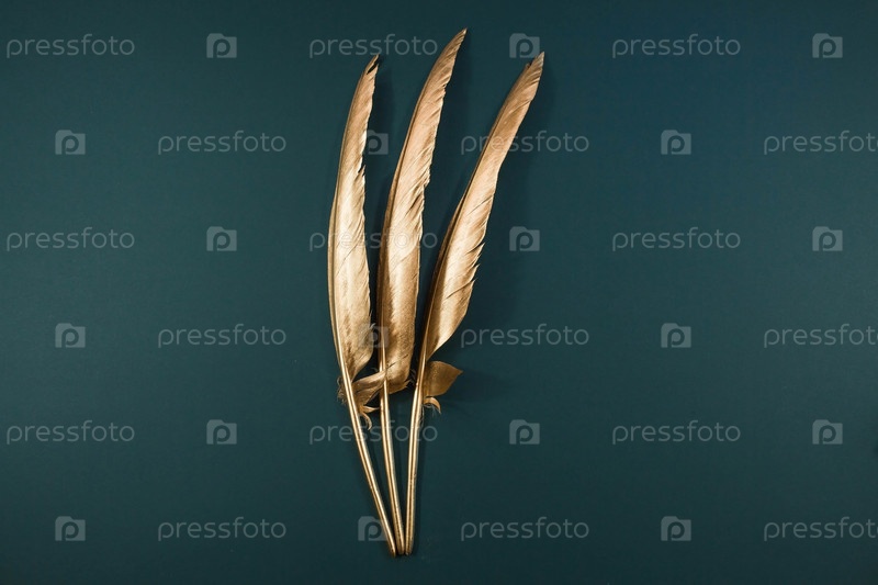 Золотое перо. Узор с золотыми перьями на модном зеленом изумрудном фоне. Вид сверху. категорически