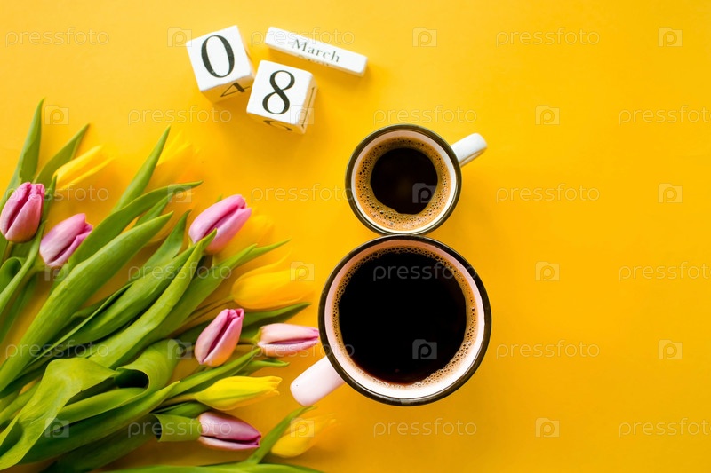 Баннер к празднику 8 марта. Две чашки горячего утреннего кофе в форме цифры 8 и букет желто-сиреневых тюльпанов на ярко-желтом фоне. Вид сверху