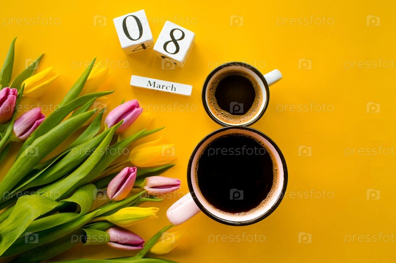 Баннер к празднику 8 марта. Две чашки горячего утреннего кофе в форме цифры 8 и букет желто-сиреневых тюльпанов на ярко-желтом фоне. Вид сверху