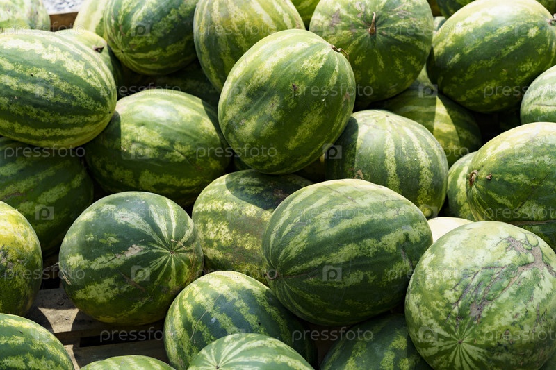 Фруктовый фон. Много больших сладких зеленых органических спелых арбузов на фермерском рынке (супермаркет). питание и витамины. Здоровая сырая пища