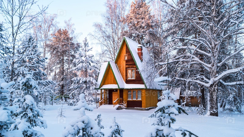 Деревенский деревянный дом в заснеженном лесу. Урал, Россия