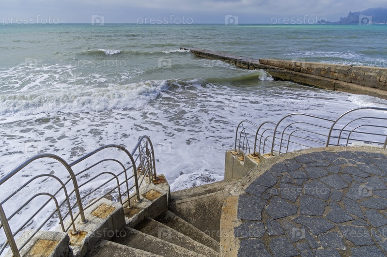 Лестница, спускающаяся на песчанный пляж. Сильный прибой достает до нижних ступенек. Судак, Крым. Конец апреля. Не сезон