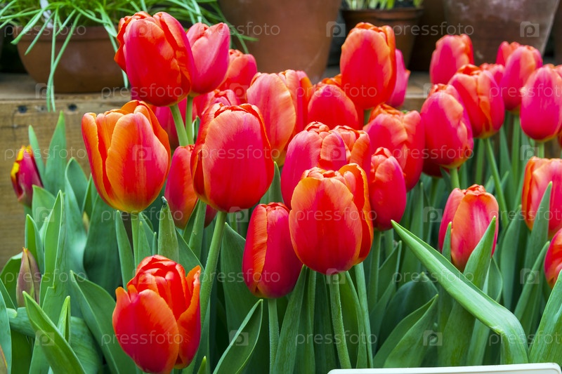 Тюльпаны сорта Orange Juice в оранжерее Аптекарского сада (филиал ботанического сада МГУ, Москва) Выставка 'Весенняя репетиция', 2019 год