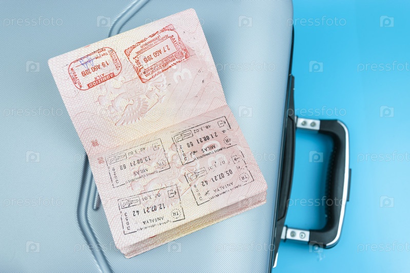 Чемодан путешественника - это паспорт с деньгами и кредитными картами на синем фоне