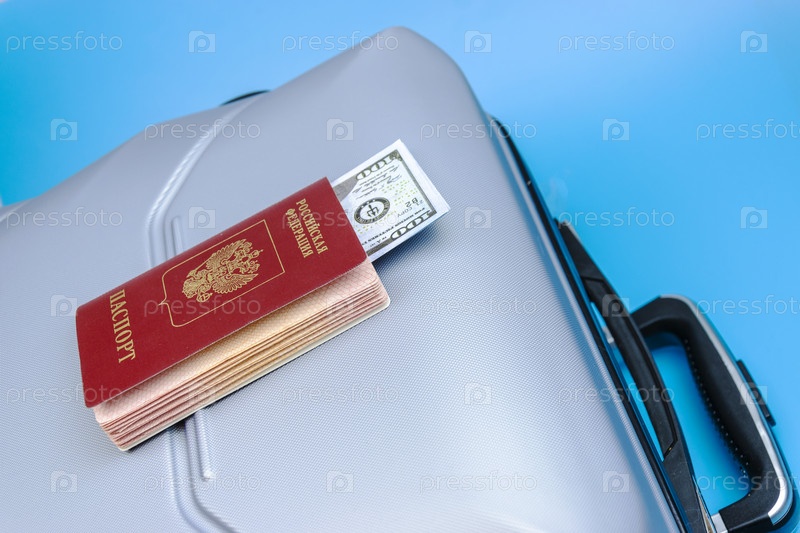 Чемодан путешественника - это паспорт с деньгами и кредитными картами на синем фоне