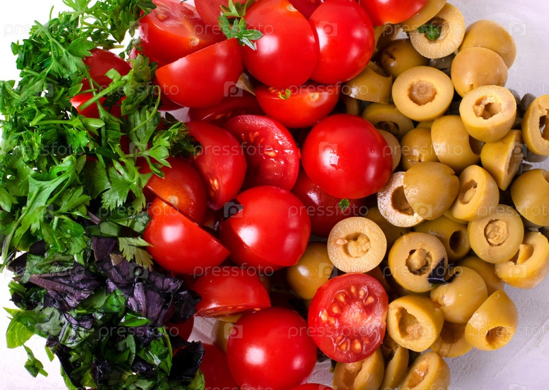 Нарезанные помидоры черри, оливки и зелень. Ингредиенты для средиземноморской еды или салата