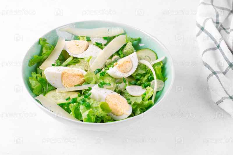 Салат с яйцами, листьями салата, сыром, огурцом, белой редькой и зеленым луком подается в миске на белом столе