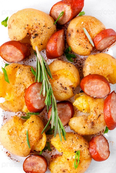 Картофельное пюре с колбасой и зеленью, запеченное в стеклянной посуде. Горячая еда. Вид сверху