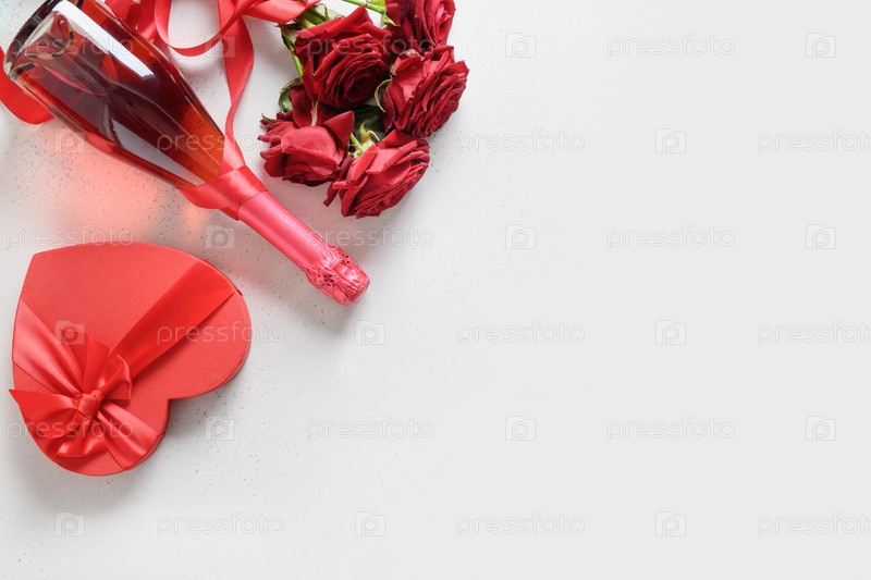 Баннер дня святого валентина с кофе, шампанским, красным подарком и букетом красных роз на белом фоне. Приглашение на свидание. Открытка с копией пространства
