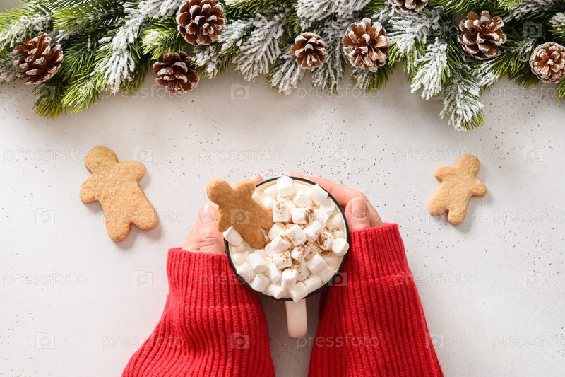 Вид сверху на рождественскую чашку горячего шоколада с зефиром, пряничным печеньем в женских руках на белом фоне. Праздничная еда на Рождество