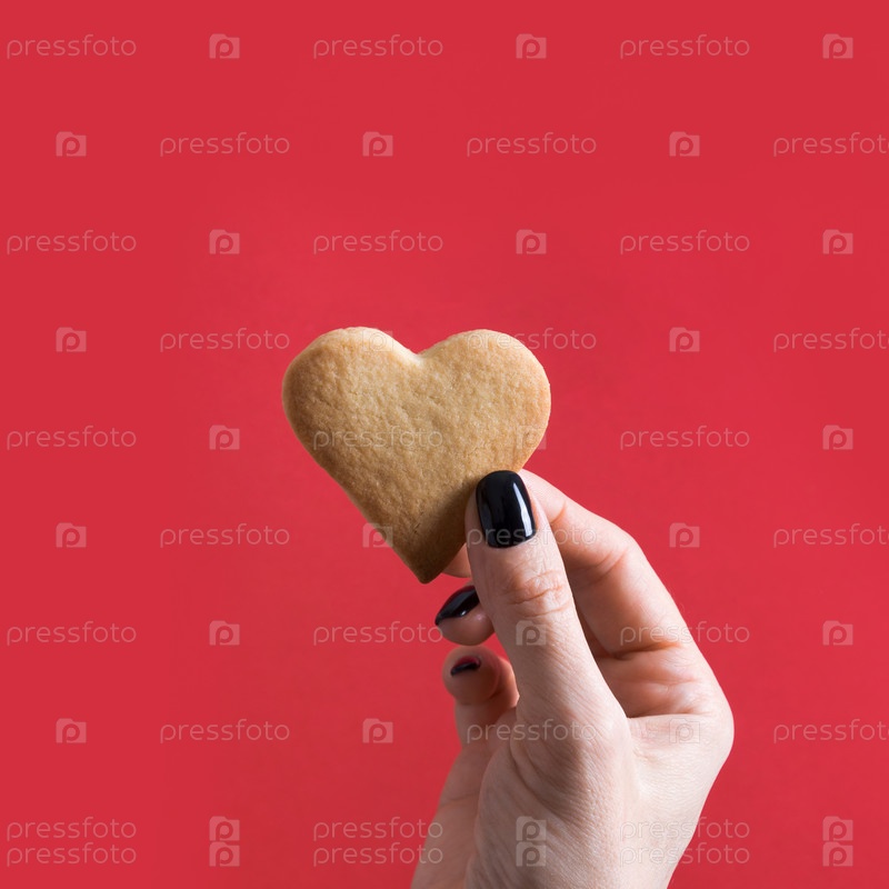 Печенье в форме сердца на День святого Валентина в женской руке на красном. Концепция