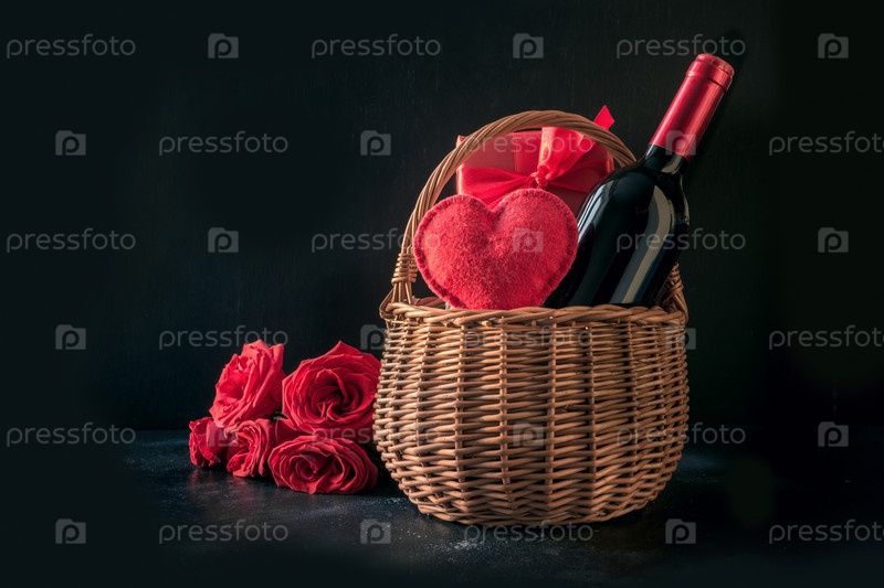 Подарочная корзина на день святого валентина, букет красных роз, бутылка игристого вина на черном
