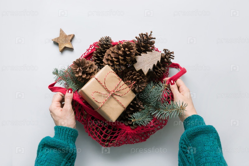 Женщина держит в руках сетчатый мешок с рождественским декором без отходов, устойчивым декором, шишками и еловыми ветками для дизайна ручной работы. Экологически чистое Рождество