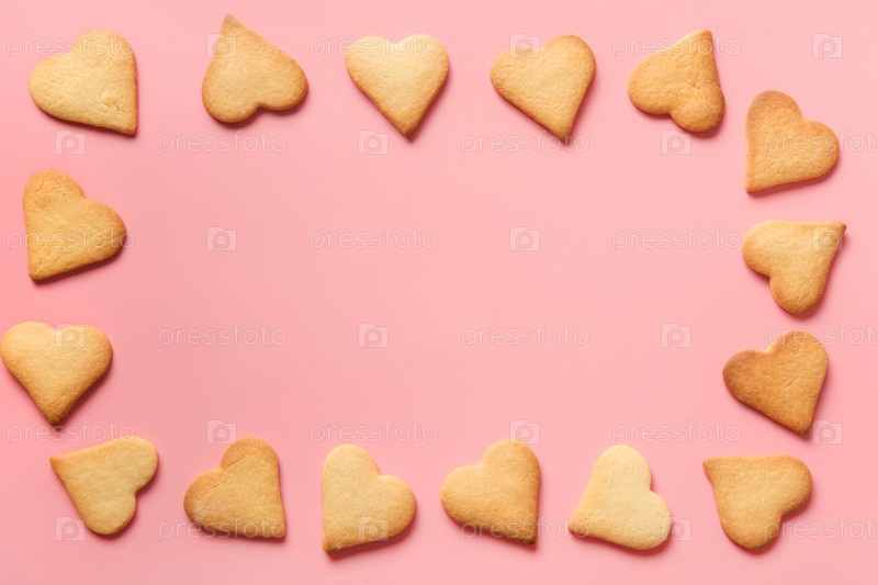 Граница домашнего печенья в форме сердца на розовом. Плоская укладка