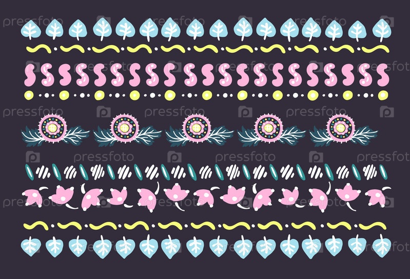Набор этнических элементов. Бордюр представляет собой полосу с цветами, листьями, ветками, вензелями. Народная вышивка. Славянский, украинский, русский мотив. Хохлома, матрешка, дымковская игрушка. Мексиканский, индийский, цыганский ковер. Вязаное кружево