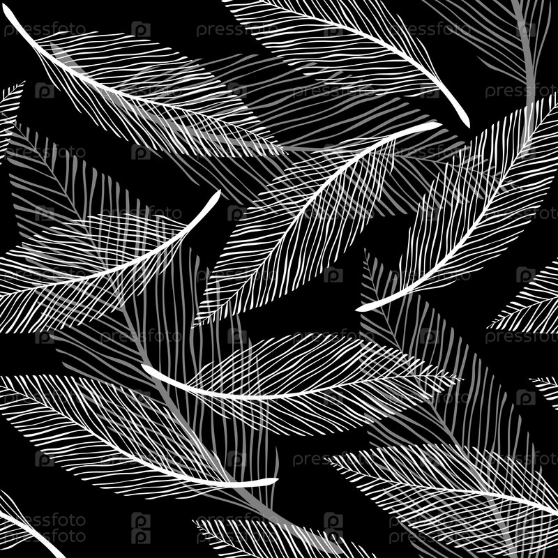 Монохромный бесшовный рисунок с перьями. Векторный дизайн