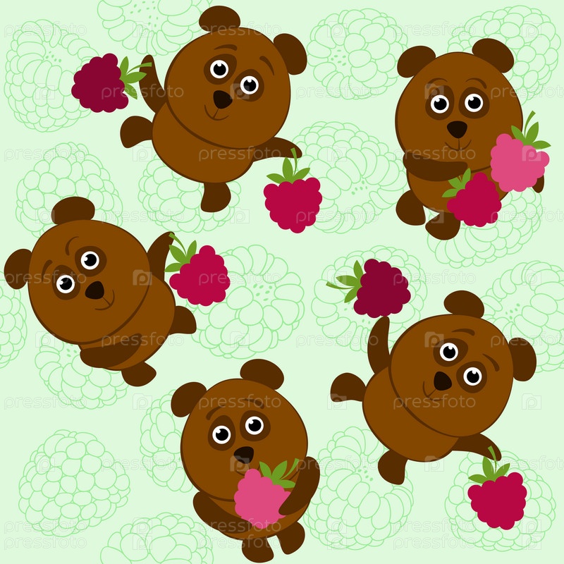 Бесшовный рисунок с мультяшным бурым медведем на фоне малины