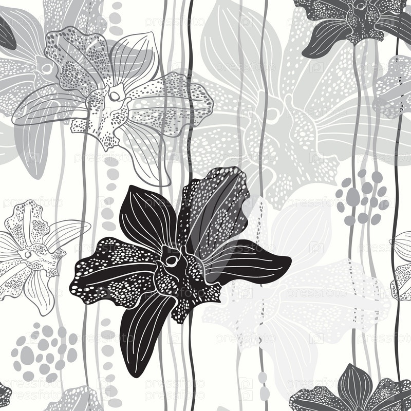 Монохромный цветочный бесшовный узор с нарисованными вручную орхидеями. Векторный дизайн