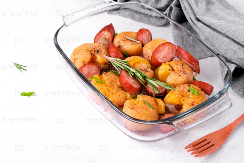 Картофельное пюре с колбасой и зеленью, запеченное в стеклянной посуде на белом столе. Горячая еда