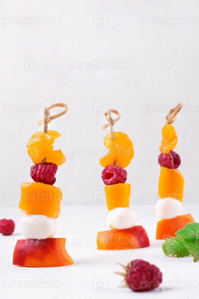 Фруктовые шашлычки с манго, мандарином, персиком, малиной и моцареллой на белом столе. Здоровый летний десерт. Еда для вечеринок