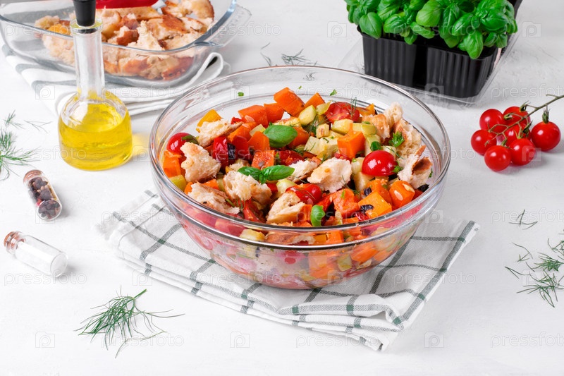 Салат с запеченными овощами, гренками, оливками, каперсами, помидорами черри, базиликом и оливковым маслом подается в стеклянной посуде. Средиземноморская еда