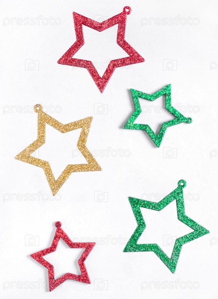 Украшения в форме летающих звезд разных цветов на белом. Рождественский фон. Левитация