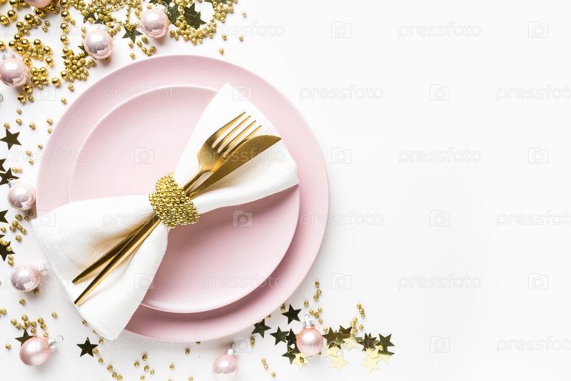 Сервировка рождественского стола с розовой посудой, золотое серебро на белом фоне. Вид сверху