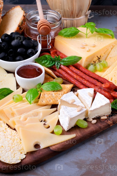 Сырное ассорти с сырным ассорти, колбасой, джемом, маслинами, кедровыми орешками и виноградом с базиликом. Вариация закуски