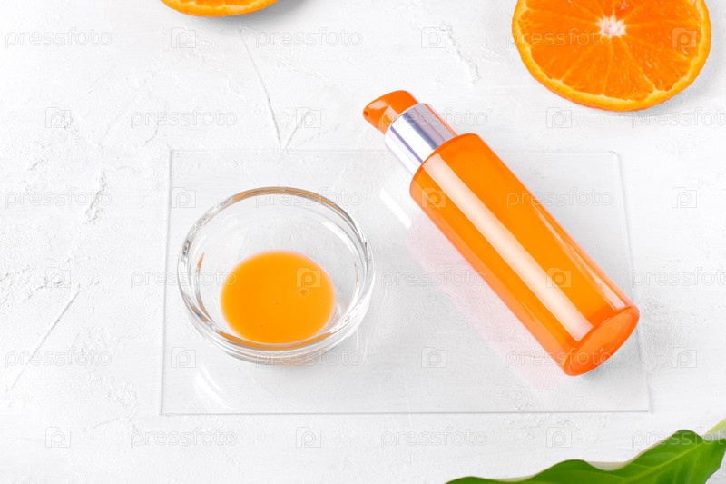 Оранжевая бутылка-дозатор и кусочки мандарина на белом. Средство по уходу за кожей с цитрусовыми. Немаркированный контейнер для жидкого мыла, шампуня или геля для душа