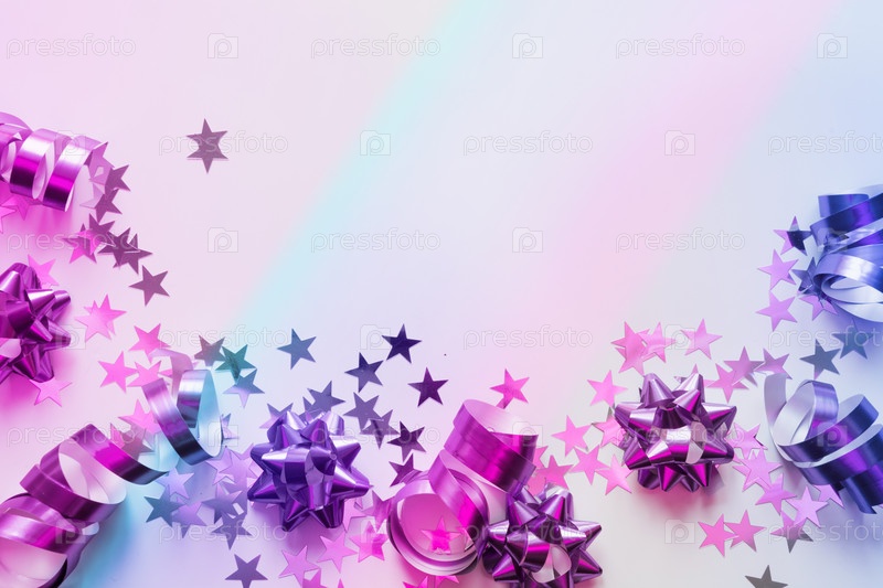Рождественская рамка из серебряного и розового пастельного украшения, растяжки, мишура, звезда, неоновый градиент на белом. Рождество. Плоская укладка. Вид сверху с копией пространства