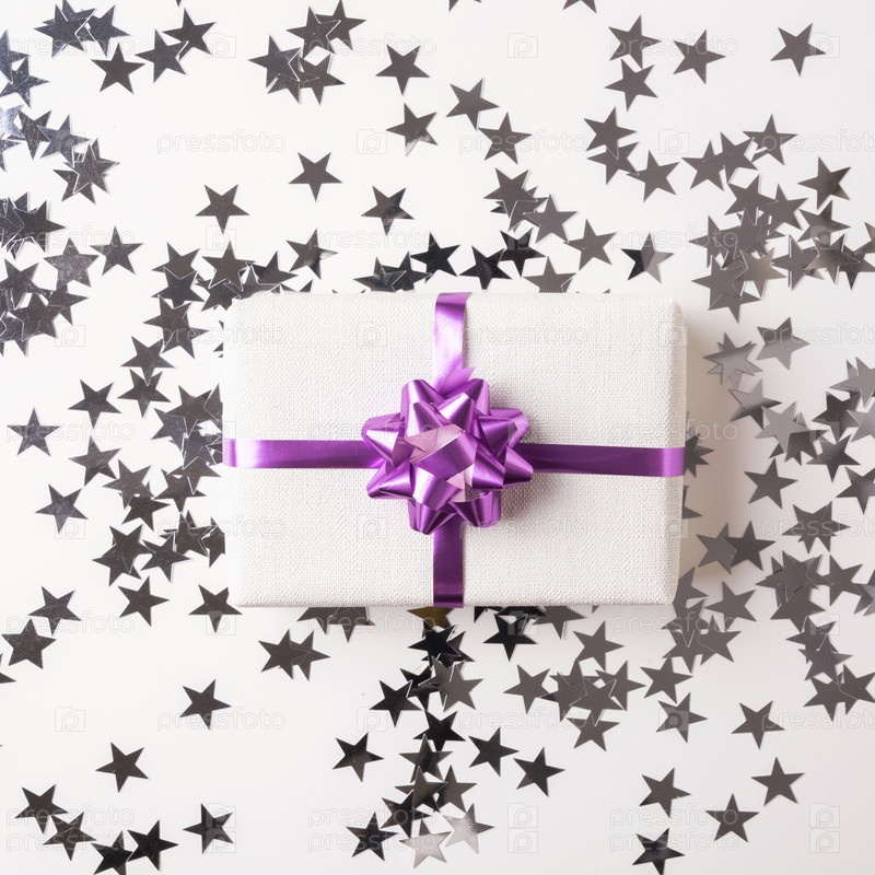 Рождественская подарочная коробка с фиолетовым бантом на белом столе с серебряной звездой. Рождество. Плоская укладка. Вид сверху