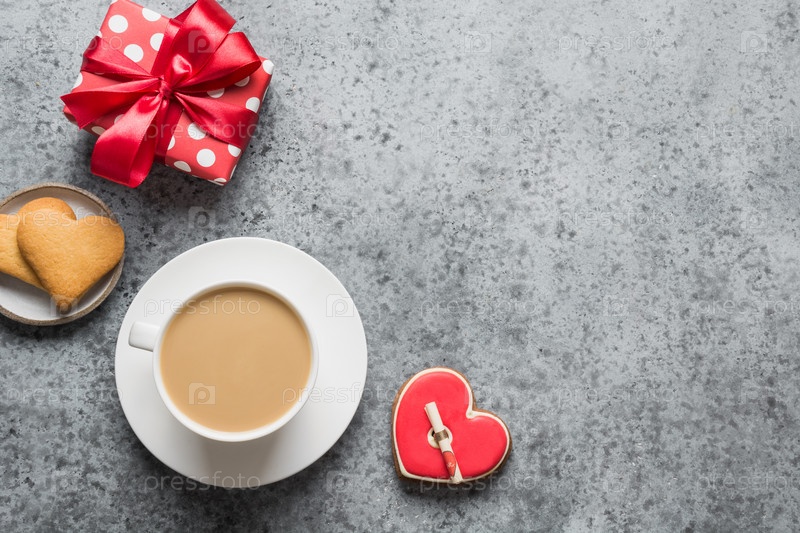 Открытка на день Святого Валентина с сердечным печеньем, подарком, чашкой кофе на сером столе. Вертикальный