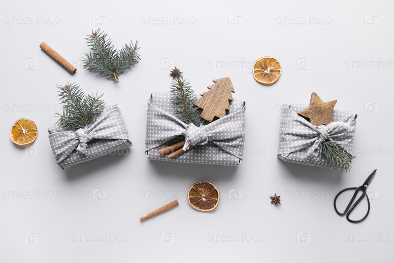 Рождественские подарки, завернутые в серую ткань с натуральным декором. Устойчивые подарки. Ноль отходов. Рождественский экологический праздник. Традиционный японский стиль фурошики. Вид сверху. Плоская укладка