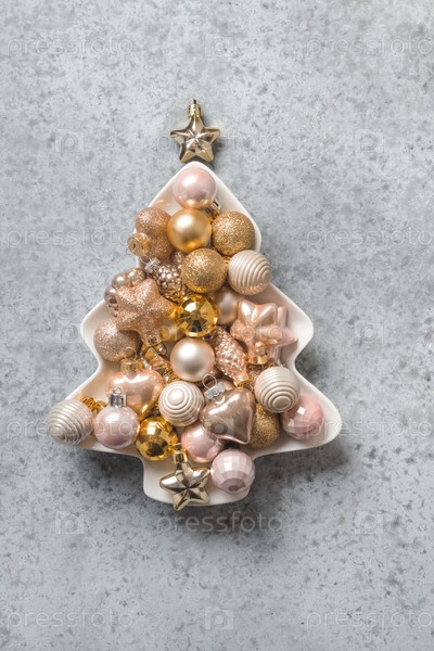 Декоративная елка из золотых шаров в белой тарелке на сером камне. Рождественская открытка. Вид сверху, плоская планировка