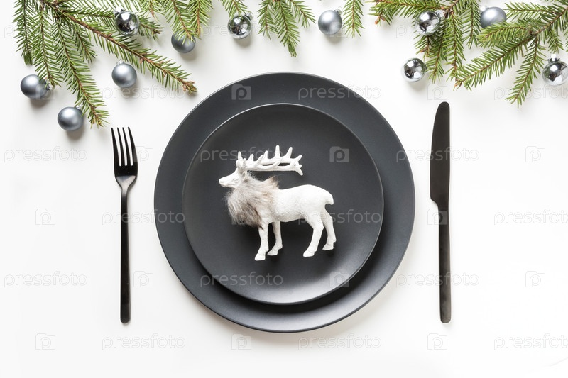 Рождественская сервировка черного стола с оленями на белом фоне. Вид сверху