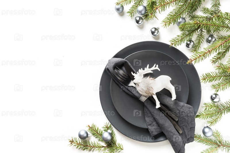 Рождественский черный стол с оленями на белом фоне. Вид сверху