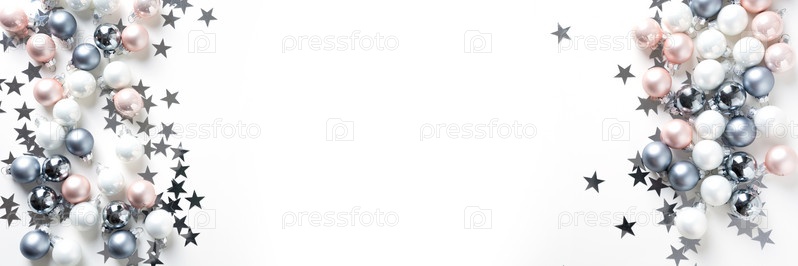 Рождественский баннер из пастельных красочных безделушек на белом. Рождество. Плоская укладка. Вид сверху с копией пространства