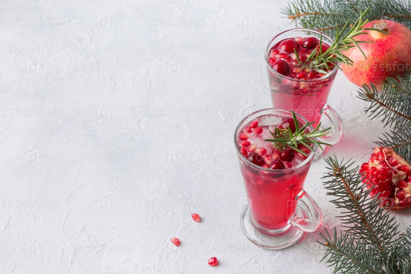 Гранатовый рождественский коктейль с розмарином, клюквой, шампанским, содовой на сером столе. Рождественский напиток