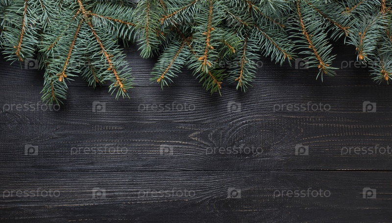 Рождественская рамка из еловых веток на темной деревянной доске. Вид сверху