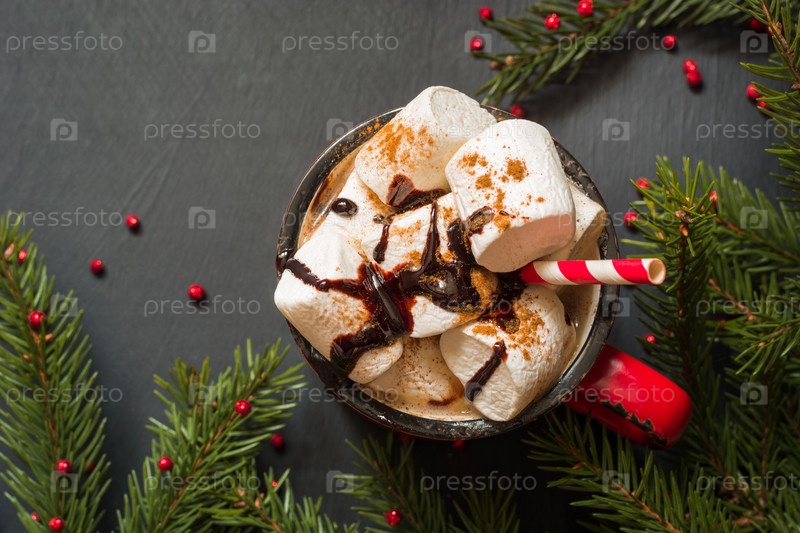 Кружка горячего шоколада и кофе с зефиром с ветвями елки на черном фоне. Вид сверху. Рождество
